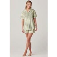* Button-through short sleeved top* Drawstring shorts* Crisp, fresh cotton* Classic gingham check* Choice of blue or green* Sizes 8-18Stay cool and comfortable in this crisp cotton short pyjama set, perfect for warm nights and relaxed mornings. The button-through short-sleeved top and drawstring shorts offer a breezy, easy fit. Featuring a classic gingham check in your choice of blue or green, it brings a fresh, timeless look to your nightwear. Available in sizes 8 to 18, its a great choice for summer l...