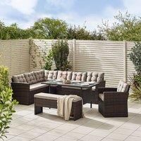 The Marbella large casual outdoor dining set features a corner sofa, arm chair, dining table and 2 seater bench. Perfect for large families or for hosting BBQs. The brown rattan weave is complimented by brown cushions on the seat and back of the sofa and arm chair, and the seat of the bench. The rectangular dining table measures 145x80cm and has a black tempered glass top. The PE resin rattan is UV resistant and weather resistant so it can be left outdoors all year round. It's low maintenance, needing ... - Manufacturers part number: FurnitureboxUK_5056542652134