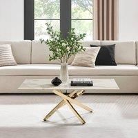 Our Leonardo glass marble effect coffee table has shiny chrome gold legs in a stylish nested starburst design. We are excited to bring you this update to our popular Leonardo range! Combining minimalist design with classy contemporary style, the Leonardo glass marble coffee table will transform your living room. The marble-effect glass tabletop has a veining pattern and, when paired with the reflective gold legs, creates an ultra modern, sleek and spacious feel for your home that adds a focal point without overwhelming your space. This rectangular tabletop is made from strong tempered glass with a marble effect and a flat edge. It's sat on top of sturdy gold chromed legs, so it's not only designed to last but to look great while doing it! Available in a range of other colour/materials, with matching console tables, side tables and dining sets, so check out the full Leonardo range for more ideas. Note: The marbling effect is a bespoke and unique pattern each time, to reflect the one-of-... - Manufacturers part number: FurnitureboxUK_5056542693656