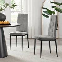 Our Paloma fabric dining chair is a great addition to any contemporary dining or kitchen space! A modern design featuring straight lines, a tall back and square stitching with button tufting details to the chair and seat. Upholstered in a lovely fabric that has a textured weave, sat on sturdy black metal legs, and is ergonomically designed for comfort and support. Available in multiple colours, so shop the full Paloma range now! | FurnitureboxUK Set 2 Paloma Modern Fabric Dining Chairs On Black Legs in Grey - Manufacturers part number: FurnitureboxUK_5056542696886