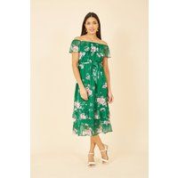 In a print that looks like it is straight out of an English garden, bold roses and florals give this green dress a romantic feel. A soft, feminine and elegant dress, featuring a ruffled Bardot top, a waist tie and a layered frill hem. Match with strappy sandals for effortless chic. | Yumi Women's Green Floral Bardot Midi Dress With Frill Hem | Size: 8 - Manufacturers part number: Yumi_5056562254349