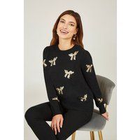 Sparkle through the season with this stunning Black knit jumper with gold sequin all-over applique bows. Easy to match and full of fun, just pair with a leather jacket to complete the look. - Manufacturers part number: Yumi_5056562256343