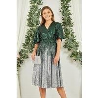 If you're looking for the ultimate party dress this season - Look no further! This midi length dress in a unique Ombre sequin effect in Green to silver is topped with a kimono sleeve and cinched waistline. The wrap neckline flatters with a V shape. Add silver accessories and dazzle in this show stopper. - Manufacturers part number: Yumi_5056562269817