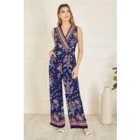 With a stunning all over paisley print with border trim detail, this jumpsuit from Yumi shouts for summer time! The soft viscose fabric is lightweight and super soft against the skin, perfect for taking on holiday or wearing to invites this season. The wrap over neckline and wide leg design is cinched at the waist with a belt to give that enviable silhouette. | Yumi Women's Navy Paisley Border Print Wrap Jumpsuit | Size: 14 - Manufacturers part number: Yumi_5056562283561