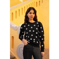 The cutest little jumper for the new season. The all over daisy embroidery adds to the charm of this knitwear. In a classic crew neck shape, with a relaxed fit that is perfect for pairing with denim or wide leg trousers and trainers. | Mela Women's Black All Over Embroidered Daisy Knitted Jumper | Size: Large - Manufacturers part number: Mela_5056562296950