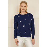 The super cute star print jumper with Silver foil detail is perfect for the seasons changing. Made from a lovely soft fine knit, with round collar. Style with your jeans for an off duty look at the weekend, | Yumi Women's Navy Silver Foil Star Print Relaxed Fit Jumper | Size: Small - Manufacturers part number: Yumi_5056562300145