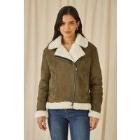 Gorgeous outerwear is where it's at for the new season! This faux suede biker style jacket, with shearling style collar and cuffs looks great over your everyday fits. The zipper details add to the cool style, with buckles on the hip and collar so it can be worn as a high collar style too! | Yumi Women's Green Faux Suede & Shearling Biker Jacket | Size: 14 - Manufacturers part number: Yumi_5056562304280