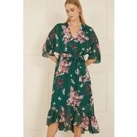 Flaunt your new fit at any special occasion this season, in this absolute knock out from Yumi. With a dipped hemline that swishes and flows, 3/4 length kimono style sleeves and that darling floral print, we know you will feel a million dollars in this dress. The wrap over neckline and self tie belt creates and lovely silhouette. Wear to a wedding or ladies day at the races and wait for the compliments to roll in. | Yumi Women's Green Floral Kimono Dipped Hem Dress | Size: 10 - Manufacturers part number: Yumi_5056562319680