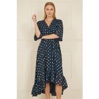 This gorgeous wrap over midi dress is ready for any occasion this season. The all over foil print adds a touch of glamour that would look great at a winter wedding or Christmas party. With sheer kimono style sleeves, a floaty frilled dip hemline and tie belt at the waist. - Manufacturers part number: Yumi_5056562319840