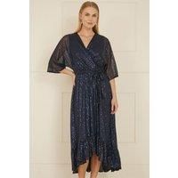 This kimono shape dress is the ultimate party piece! With flowy dip hem style, with all over shimmering sequins that catch the light beautifully. The tie at the waist and V neckline are incredibly elegant and will look amazing at any event or invite this festive season. | Yumi Women's Navy Sequin Kimono Midi Wrap Dress | Size: 8 - Manufacturers part number: Yumi_5056562320037