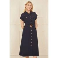 Keep it cool in neutrals this season. This midi length shirt dress from Yumi is an essential if you need add some style to your wardrobe. With a button down design, pockets and a wooden belt this dress is super flattering and easy to wear everyday. Crafted from linen feel viscose for an elevated fit. Style with trainers and gold jewellery this season.- Crafted from a soft viscose- Stylish and relaxed fit- Wooden belt and button down style- Pockets for added convenience | Yumi Women's Navy Viscose Linen Look Midi Shirt Dress With Wooden Belt | Size: 20 - Manufacturers part number: Yumi_5056562324752