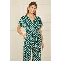 A great jumpsuit can be the key to summer dressing - Occasions and casual covered in this geometric print all in one. Made from a silky lightweight fabric, with angel sleeves, self tie waistline and wide leg flowing legs this one is so flattering and easy to wear. With pockets as a cute extra feature, we love this style with strappy sandals and statement earrings. | Yumi Women's Green Geometric Print Wrap Jumpsuit | Size: 16 - Manufacturers part number: Yumi_5056562324851