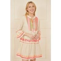 Perfect for packing for your summer getaway this year - This stunning tunic is perfect for beach or relaxing at the poolside. In a relaxed shape in a shorter length, we love the soft and breathable cotton combined with easy shape, The notch neckline is finished and this style has 3/4 sleeves. Wear with sandals over your swimwear this season.-This super cute cotton tunic is perfect for holidays this season-With gorgeous embroidery all over-The neckline boasts a tassel trim | Yumi Women's White Embroidered Cotton Tunic in Beige | Size: 16 - Manufacturers part number: Yumi_5056562337905