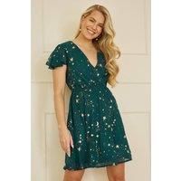 Channel your inner celestial in this divine skater dress from Yumi. With an all over star and moon print in foiled gold on a midnight Green backdrop, you'll be shining at any invite this season. The simple skater shape with wrap over neckline is mega flattering and easy to wear. Style with gold accessories to finish the look. | Yumi Women's Green Foil Star Print Wrap Skater Dress | Size: 18 - Manufacturers part number: Yumi_5056562350997