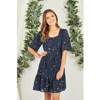 Be the star at any occasion this party season. This cute skater dress from Yumi boasts flowy sleeves, square neckline and cinched waist. The all over gold star print on the navy backdrop truly reminds constellations in the night sky. Add gold accessories for a celestial look. | Yumi Women's Navy Star Print Skater Dress | Size: 12 - Manufacturers part number: Yumi_5056562351086