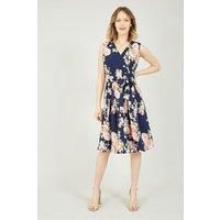 The bold navy blue tone of this Yumi wrap around dress is finished with a pretty all over rose print. The V neckline and slim fitted bodice is completed with a tie waist and knee length skater skirt. Wear with nude heels and silver accessories for a glamorous look at any occasion. | Yumi Women's Navy Rose Printed Wrap Over Sleeveless Skater Dress | Size: 18 - Manufacturers part number: Yumi_5056562401194