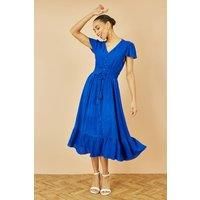 This super cute midi dress has a fun and flirty feel for the summer. The metallic thread running through adds a shimmer and shine. With a ruched waist and button details that make it ultra feminine. The v neckline is framed with fluttery sleeves and hemline.- A unique and cute design for the summer- Ruched waist and button details - Ultra feminine vibes, perfect for holidays or sunshine days | Yumi Women's Blue Button Detail Midi Dress With Ruched Waist & Metallic Thread | Size: 10 - Manufacturers part number: Yumi_5056562406618