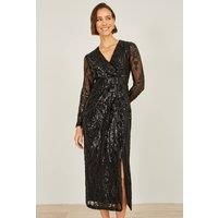The all over sequins add the drama all season long in this midi dress from Yumi. The swirling design gives a luxurious feel. The long sleeves, fitted waistline, wrap over neckline and midi length all make for a stunning design. Wear this to any invite over the festive season. - All over sequins and midi length bring the drama this season- With long sleeves and split hemline- Perfect for festive invites all season long | Yumi Women's Black Sequin Midi Wrap Dress With Split Hemline & Long Sleeves | Size: 10 - Manufacturers part number: Yumi_5056562411407