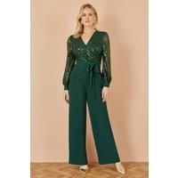 Ready to shine this party season in this gorgeous jumpsuit from Yumi. The wrap over top has long sleeves, which is super flattering. The all over sequinned top and wide leg design ensures you are ready for any invite, The pockets are an additional design feature that we know you'll love. The tie at the waist creates a beautiful silhouette. - Ready to step into party season in sequins- Long sleeve design with wrap neckline and wide legs- Pockets complete the look, perfect for any invite | Yumi Women's Green Sequin Wrap Over Jumpsuit | Size: 14 - Manufacturers part number: Yumi_5056562411704