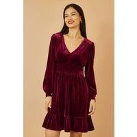 Go glam for any party invites in the new season. This long sleeve skater dress has you enveloped in gorgeous feeling velvet. With a empire line waist and ruffle detail at the hem and V neckline get ready to be the best dressed on any guest list. | Yumi Women's Burgundy Velvet Long Sleeve Skater Dress | Size: 16 - Manufacturers part number: Yumi_5056562415511