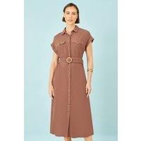 Keep it cool in neutrals this season. This midi length shirt dress from Yumi is an essential if you need add some style to your wardrobe. With a button down design, pockets and a wooden belt this dress is super flattering and easy to wear everyday. Crafted from linen feel viscose for an elevated fit. Style with trainers and gold jewellery this season.- Crafted from a soft viscose- Stylish and relaxed fit- Wooden belt and button down style- Pockets for added convenience | Yumi Women's Brown Visco...