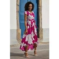 This Yumi Pink Blossom Print Wrap Midi With Dipped Hem provides a versatile option for fancy invites. Designed in a wrap shape that flows below the knee, it has a frill trim and short sleeves that flow in a relaxed shape. Complete with a tie on the waistline and a pretty pink blossom print,- Flattering wrap over shape- Flowing dip hem style- Cute cap sleeve and tie waist belt | Yumi Women's Pink Blossom Print Wrap Midi Dress With Dipped Hem | Size: 12