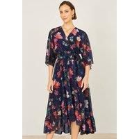 With wedding season fast approaching, this is house designed midi dress from Yumi fits the RSVP for any occasion. With a wrap over neckline, tie belt at the waist and flowy midi dip hem length. The kimono style sleeves add a flattering element to this dress. With all over floral print that is feminine and unique.- Flowy midi length dress- Gorgeous all over floral print design- Kimono style sleeves with cinched waist | Yumi Women's Navy Floral Kimono Wrap Dress With Dip Hem | Size: 14 - Manufacturers part number: Yumi_5056562504765