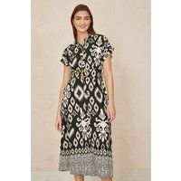 This supersoft abstract Geo print, lightweight viscose dress is perfect for adding to your vacation checklist. In an elegant button up design, with a matching belt to elevate this style. The midi length and fitted waist are super flattering and easy to wear everyday, style with sandals or trainers in the sunshine. | Yumi Women's Black Abstract Geo Print Relaxed Midi Shirt Dress With Belt | Size: 24 - Manufacturers part number: Yumi_5056562602058