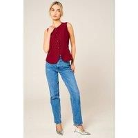 Expertly cut to sculpt the silhouette, it features a sleek sleeveless design, luxe metallic buttons, and a flattering tailored fit that defines the waist beautifully. Whether styled over a crisp shirt or worn alone for a confident statement look, its a wardrobe essential that speaks of effortless poise and power. Pair with tailored trousers or a chic skirt to complete your refined ensemble. | Femme Luxe Women's Tailored Fitted Button Front Waistcoat in Wine | Size: 10