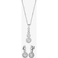 Large pav clusters with vintage-style beaded edging form the focal point of each piece in this jewellery set. The pendant graduates in size from the larger bottom cluster up to the beaded bezel-set single stones at the top, whilst the earrings are completed by three similarly sized stones. Each piece is slightly curved to give prominence to the bottom clusters. - White Cubic Zirconia - Sterling Silver - Pendant measures 21x8mm at the widest points with a 6mm bale - Droppers measures 21x8mm at the widest...