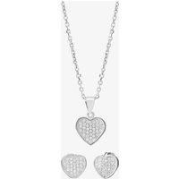 The perfect gift for the one you love. This beautifully crafted sterling silver pendant and earring set features a heart shaped design encrusted with white cubic zirconia Pave stones. The pendant sits upon an 18/ sterling silver chain complete with a lobster clasp for added peace of mind. The glistening stones will add a touch of sparkle to her everyday wear