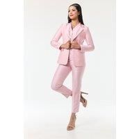 This beautiful 3 piece suit will take your style to the next level. The shining, radiant sheen of the fabric, the luscious fabric, and the glamorous, beaming pink colour will have you looking and feeling incredible. Finish it off with matching accessories and sparkling heels for a potent, red-carpet outfit all year round. Soft, luxurious pink colour fabric 3-piece suit - Trouser, Waistcoat and Blazer Material Coposition: 97.9% Polyester 2.1% Spandex Care: Dry Clean Recommended