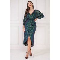 This long sleeve wrap style sequin dress is the perfect addition to your closet. The V-neckline and wrap style accentuate your figure and make you look sophisticated, while the sequin embellishment adds oodles of glamour. You can wear this sparkly emerald number as a night out dress or an elegant date night outfit, but this dress will give you an instant chic look wherever you go! The long sleeves are adorned with beautiful sequins that catch the light and make you shine bright in an elegant way. This stunning number is finished off with a detachable belt at the waist to accentuate your tiny waist. Wear this green dress with your favourite pair of heels for the ultimate chic look! - Manufacturers part number: Goddiva_