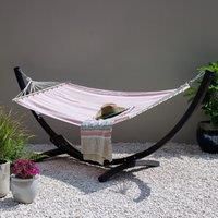 Relax in style in your garden this summer with this sophisticated wooden hammock stand. This eye-catching handcrafted stand is made from high quality pine wood finished with a unique charcoal colour featuring trend and elegance in your garden space. With two sturdy feet so you can feel free to relax in safety. Pair this with the hammock colour of your choice for your desired relaxation space. All hammock stands include accessory fittings to attach most hammocks. The Tortola Hammock offers the perfect es...