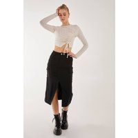 Break the rules with this Utility Cargo Midi Slit Skirt. It's the perfect choice for a streetwear look while feeling cool and sexy. | Pink Vanilla Women's Utility Cargo Midi Slit Skirt in Black | Size: 6 - Manufacturers part number: Pink Vanilla_5056651243469