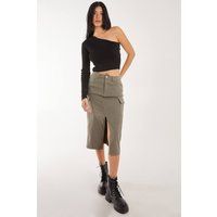 Break the rules with this Utility Cargo Midi Slit Skirt. It's the perfect choice for a streetwear look while feeling cool and sexy. | Pink Vanilla Women's Utility Cargo Midi Slit Skirt in Khaki | Size: 8 - Manufacturers part number: Pink Vanilla_5056651243520