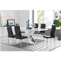 A six-seater chrome metal and white high gloss dining table from the Atlanta collection with 6 Black velvet Milan chairs. Features: Modern on-trend design Modern high gloss dining table Chair Dimensions: Width-40cm Depth-50.5cm Height-97.5cm Seat Height-46cm High quality finish runs throughout Unique leg design Strong metal support Modern on-trend design Specifications: Dimensions: H:75.0 x W:90.0 x D:160.0 cm Colour: Black Guarantee:1 Year Guarantee Material: Manufactured Wood,metal,velvet Model Number...