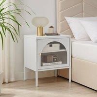 Our Urbi metal bedside table with door perfectly blends form and function in a stylish modern design that nods to retro industrial art deco styles. The powder-coated metal bedside cabinet features a hinged door, gold doorknob and arched glass panel with ribbed tempered glass that adds dimension and interest. The flat top gives plenty of space for bedside essentials. Inside, the single shelf allows for greater storage space to keep everything tidy. A lovely contemporary bit of bedroom storage that will suit a range of home styles. Also comes with matching larger storage furniture available. Shop the Furniturebox Urbi range today! | FurnitureboxUK Urbi Metal Bedside Cabinet With Shelf in White - Manufacturers part number: FurnitureboxUK_5056657188474