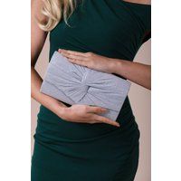 Elevate every look with our timeless clutch bagscrafted for elegance, designed to impress. Featuring refined finishes and a sleek chain strap, they're the ultimate statement in luxury. Polyester. L:23.5cm W:4cm H:12.5cm. | SVNX Women's Ruched Bow Clutch Bag in Silver - Manufacturers part number: SVNX_5056657339586