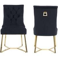 Elevate your dining space with this black velvet dining chair, featuring plush upholstery, a deep tufted backrest, and foam cushioning for luxurious comfort. Designed for modern elegance, it boasts a sturdy wooden frame, gold-plated stainless steel legs, and a chic gold ring pull for added flair and easy movementperfect for upscale dining rooms or stylish accent seating in contemporary interiors. | Life Interiors Set of 2 Ambra Modern Velvet Dining Chairs with Gold Legs, Ring Handle & Tufted Back in Black - Manufacturers part number: Life Interiors_5056660011561