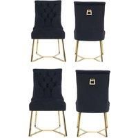 Elevate your dining space with this black velvet dining chair, featuring plush upholstery, a deep tufted backrest, and foam cushioning for luxurious comfort. Designed for modern elegance, it boasts a sturdy wooden frame, gold-plated stainless steel legs, and a chic gold ring pull for added flair and easy movementperfect for upscale dining rooms or stylish accent seating in contemporary interiors. | Life Interiors Set of 4 Ambra Modern Velvet Dining Chairs with Gold Legs, Ring Handle & Tufted Back in Black - Manufacturers part number: Life Interiors_5056660011608