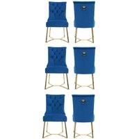 Elevate your dining space with this black velvet dining chair, featuring plush upholstery, a deep tufted backrest, and foam cushioning for luxurious comfort. Designed for modern elegance, it boasts a sturdy wooden frame, gold-plated stainless steel legs, and a chic gold ring pull for added flair and easy movementperfect for upscale dining rooms or stylish accent seating in contemporary interiors. | Life Interiors Set of 6 Ambra Modern Velvet Dining Chairs with Gold Legs, Ring Handle & Tufted Back in Blue - Manufacturers part number: Life Interiors_5056660011677