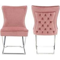 Add a touch of contemporary glam to your space with this velvet tufted dining chair, featuring plush foam cushioning, soft velvet upholstery, and a high diamond-tufted backrest with elegant button detailing and 8mm piping. Supported by sleek, curved chrome silver legs, this chair offers both stability and style, making it a perfect statement piece for modern dining rooms, home offices, or chic accent areas. | Life Interiors Set of 2 Trafalgar Velvet Tufted Dining Chairs with Chrome Silver Legs in Pink - Manufacturers part number: Life Interiors_5056660011943