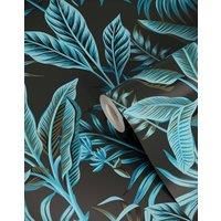 In this wallpaper, strong colors over a gray background create a striking print that brings tropical leaves to life, resulting in a print that has lasting appeal. This wallpaper is 75cm wide and 7m long. | Bobbi Beck Eco-Friendly Bold Tropical Wallpaper in Blue - Manufacturers part number: Bobbi Beck_5056669710564