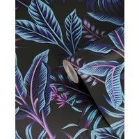In this wallpaper, strong colors over a gray background create a striking print that brings tropical leaves to life, resulting in a print that has lasting appeal. This wallpaper is 75cm wide and 7m long. | Bobbi Beck Eco-Friendly Bold Tropical Wallpaper in Purple - Manufacturers part number: Bobbi Beck_5056669710595