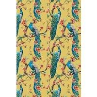 As the wallpaper repeats horizontally, it creates a beautiful sense of height and depth that is complemented by the rich texture of the Bird of Paradise illustrations. This wallpaper is 75cm wide and 7m long. | Bobbi Beck Eco-Friendly Peacock Floral Pattern Wallpaper in Yellow - Manufacturers part number: Bobbi Beck_5056669714692