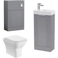 Designed for smaller bathrooms and ensuites, this complete cloakroom set includes a fluted wall hung vanity, WC unit, back to wall toilet pan, soft-close seat, chrome or brass mixer tap, waste, push button, and dual flush concealed cistern. The compact design and bold detailing create a refined look with practical functionality and efficient storage. | Balterley Cloakroom Suite Floor Standing Vanity Toilet Tap Set - Grey Chrome - Manufacturers part number: BFZRE007