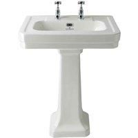 Victrion 640mm Basin & Pedestal 2TH Features: Exquisite traditional styling Supplied with full pedestal for a classically styled look Pre-drilled 2 tap holes Manufactured from high quality ceramic Multiple grill finishes available Waste supplied separately Specifications: Dimensions: H:825.0 x W:640.0 x D: cm Colour: White Guarantee:10 Years Model Number: VCBP002