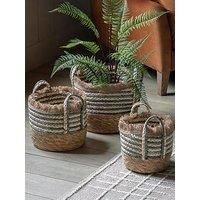 With tactile woven textures, distinctive ink blue stripes and soft fringing, this set of 3 baskets are the perfect stylish storage solution. Great for blankets, faux plants and more. Specifications: Dimensions: H:25 x W:30 x D:30 cm Weight: 2.0 kg Colour: Brown Guarantee: 12 Months Manufacturing Material: Hyacinth Model Number: 5056693592105