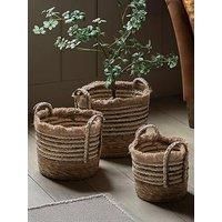 With tactile woven textures, distinctive brown stripes and soft fringing, this set of 3 baskets are the perfect stylish storage solution. Great for blankets, faux plants and more. Specifications: Dimensions: H:25 x W:30 x D:30 cm Weight: 2.0 kg Colour: Brown Guarantee: 12 Months Manufacturing Material: Hyacinth Model Number: 5056693592112